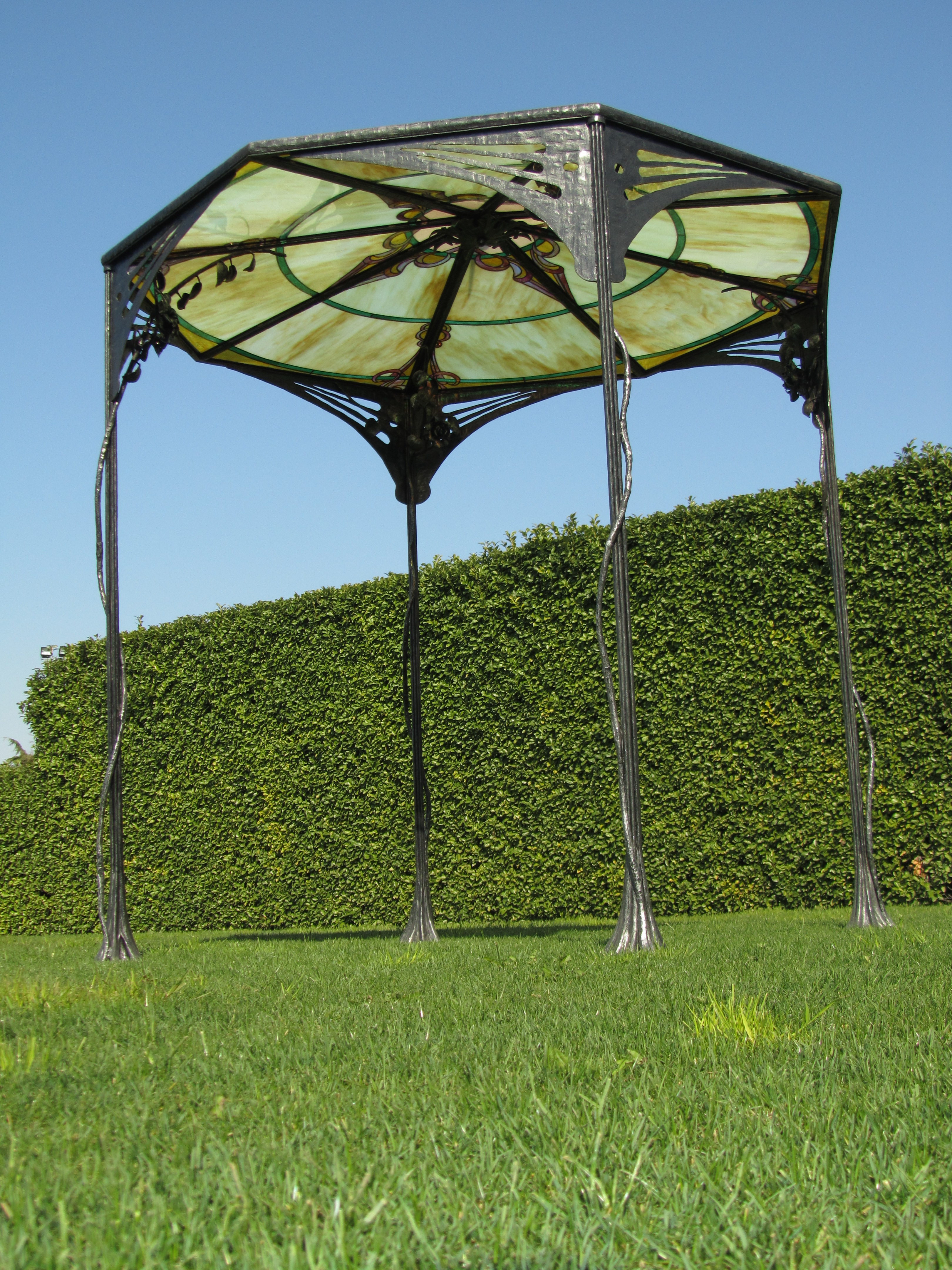 Il vetro soffiato in questo progetto si accosta bene alla realizzazione di una struttura in ferro battuto che con le sue volute e gli elementi floreali sarà essa stessa il raccordo perfetto tra le piante che circonderanno il gazebo e la vetrata artistica che potrà essere invece realizzata con uno stile adatto al gusto o alla necessità.